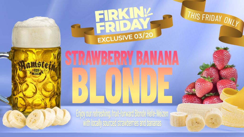 Try our Strawberry Banana Blonde this Friday! Experience the fruit-forward version of our refreshing Blonde Hefe-Weizen, now infused with locally sourced strawberries and bananas.